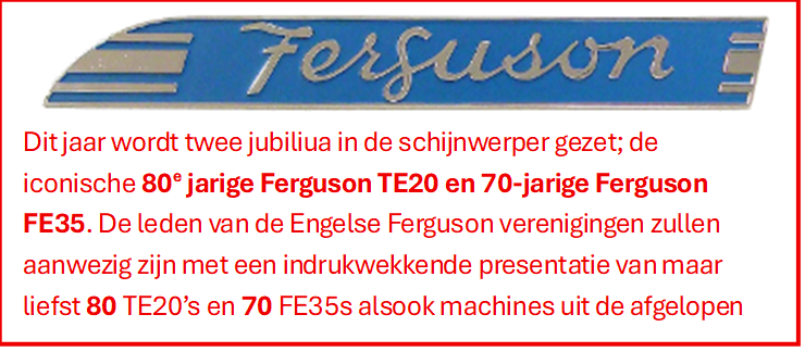 Ieder jaar, in februari, is er de Tractor World Show. Deze show trekt 15.000 bezoekers en er worden 1200 kavels te koop aangeboden. De Ford en Fordson club alsook een tiental andere tractorclubs zijn er aanwezig. Dit jaar zet de Show de Ferguson TE20 en FE35 in de schijnwerpers. We bezoeken bijzondere privé – FORD - collecties, waaronder de grootste Ford County verzameling van het land én een privé Ford- en Fordsonmuseum.